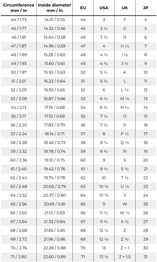All our ring sizes are given in the EU sizing system, where the size corresponds to the inner ring circumference length in millimeters.